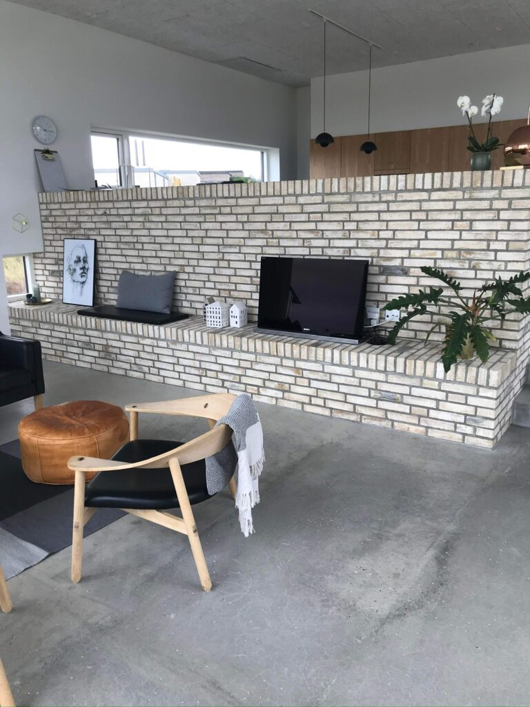 Murede detaljer giver haven og husets uderum et flot finish. En støbt trappe, betongulv i carporten og fliser på terassen skaber funktion og nemt vedligehold i alt slags vejr.